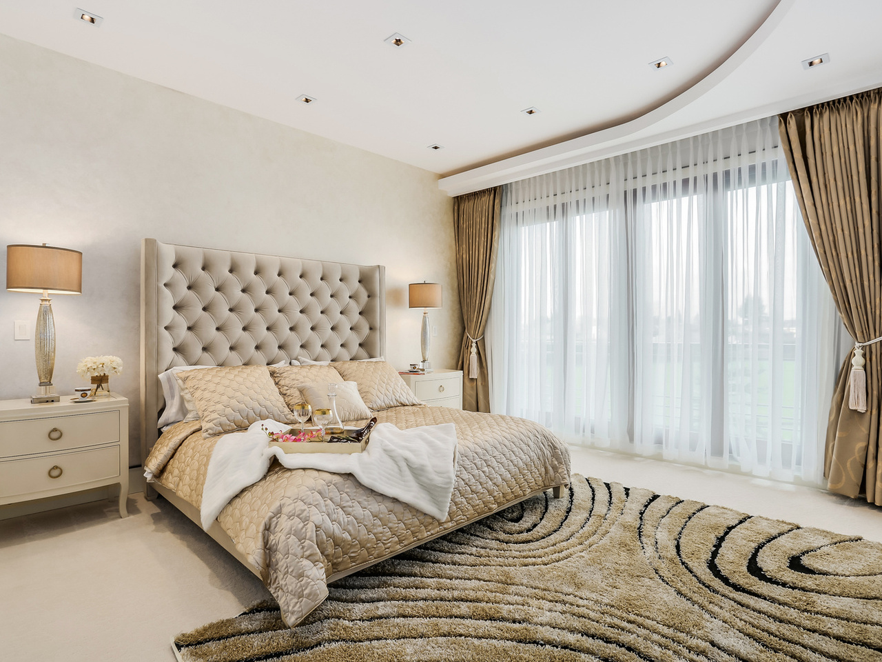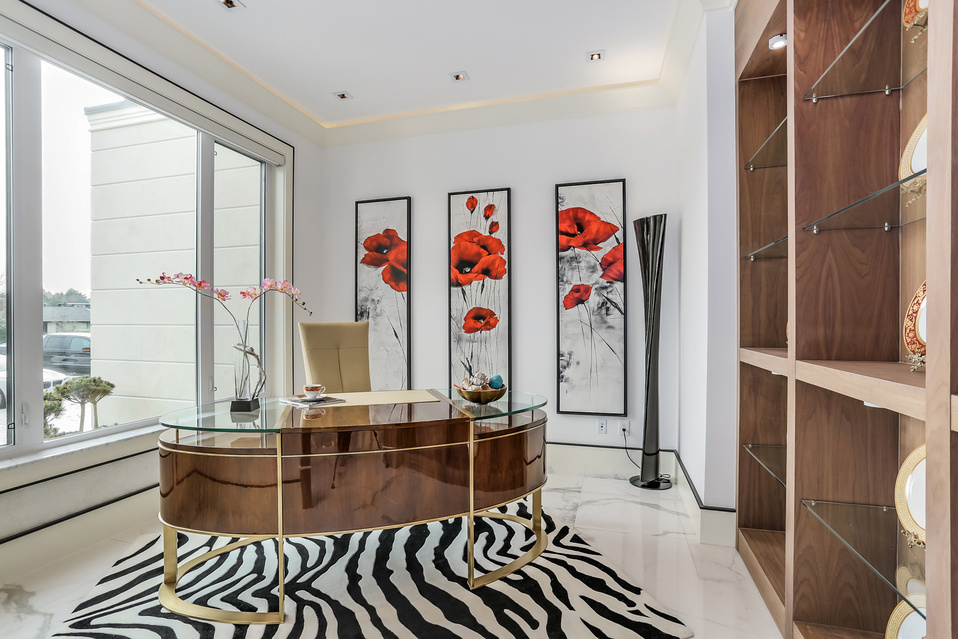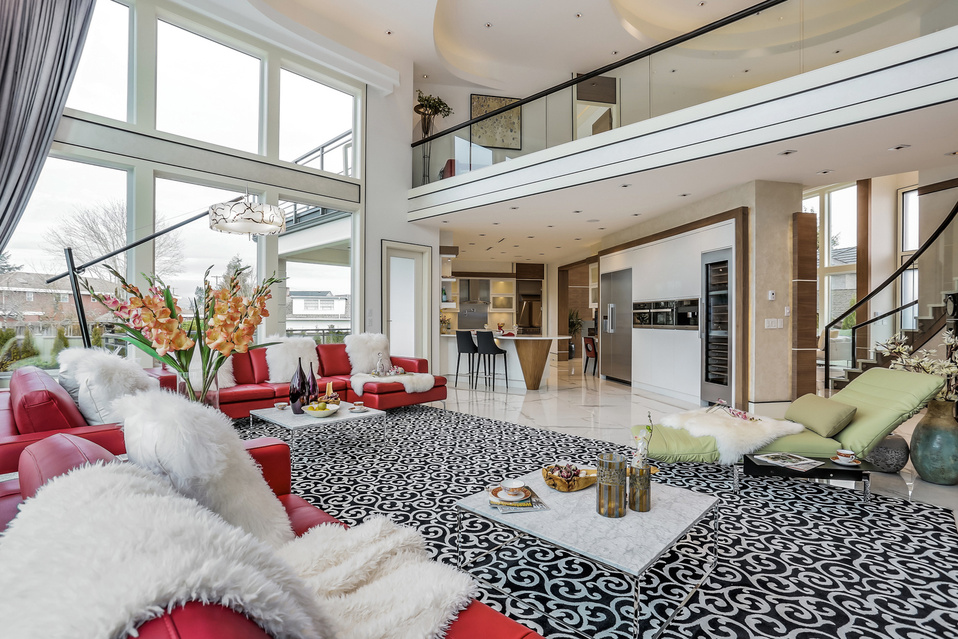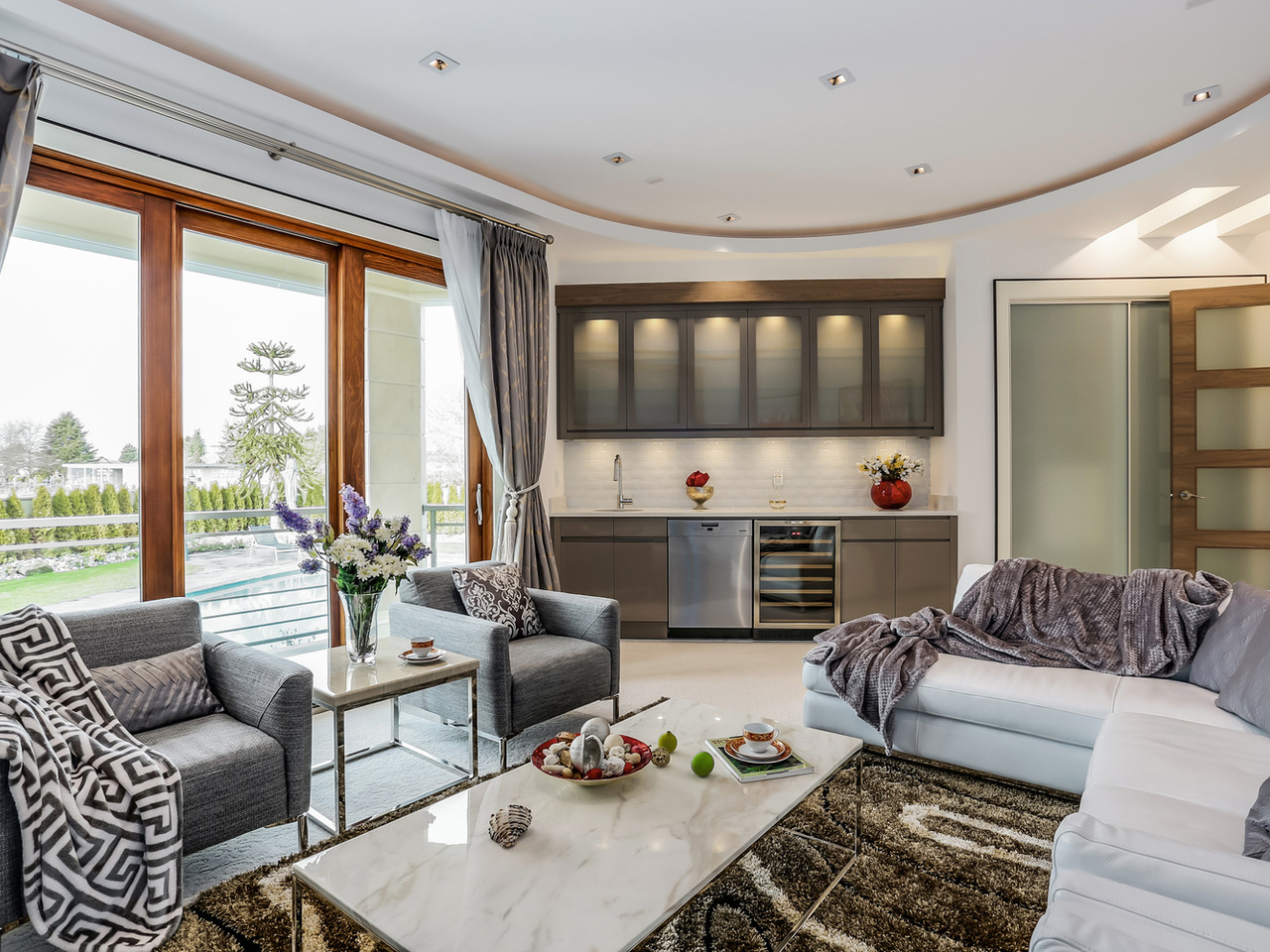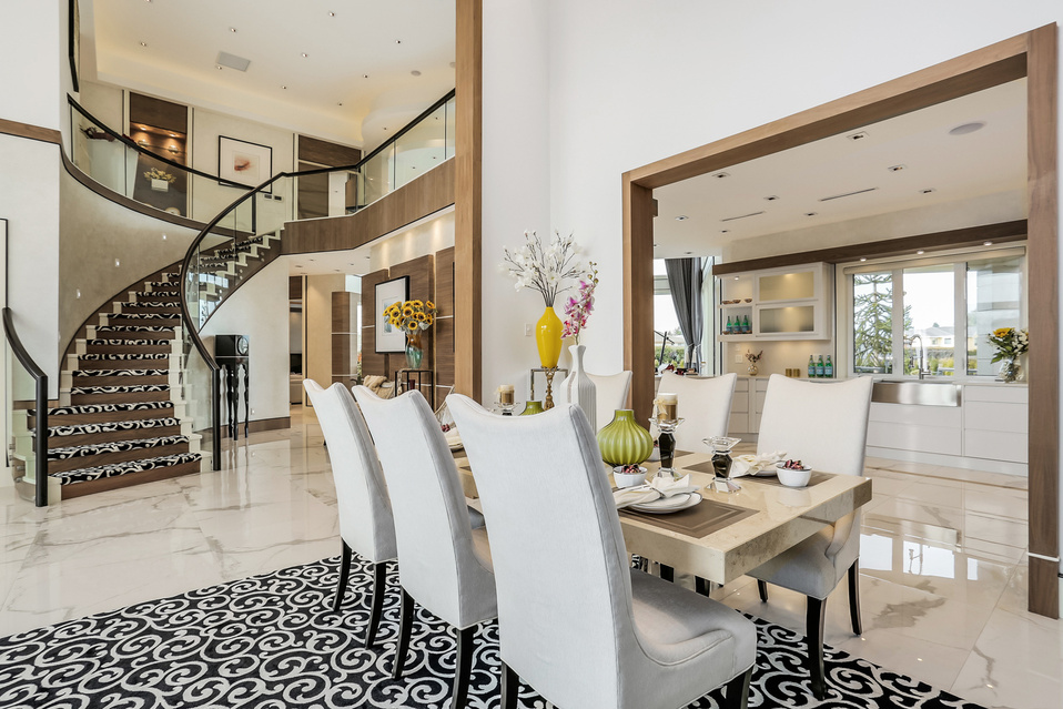 oaring ceiling heights paired with dramatic multi-layer drop ceilings create a true sense of volume and presence throughout the main living areas.