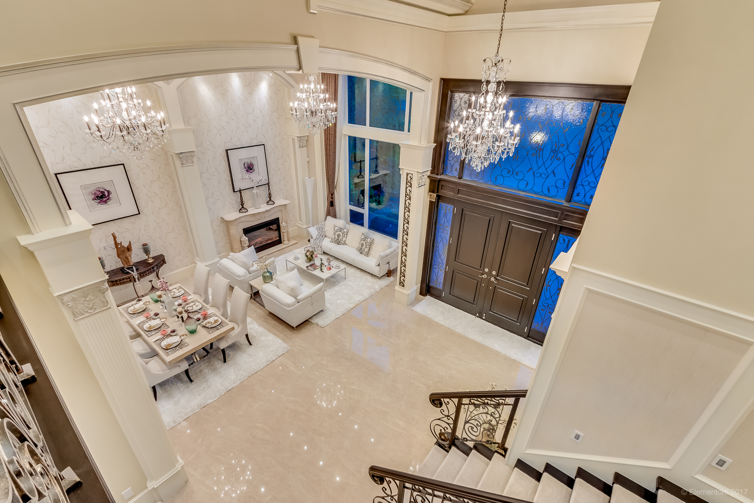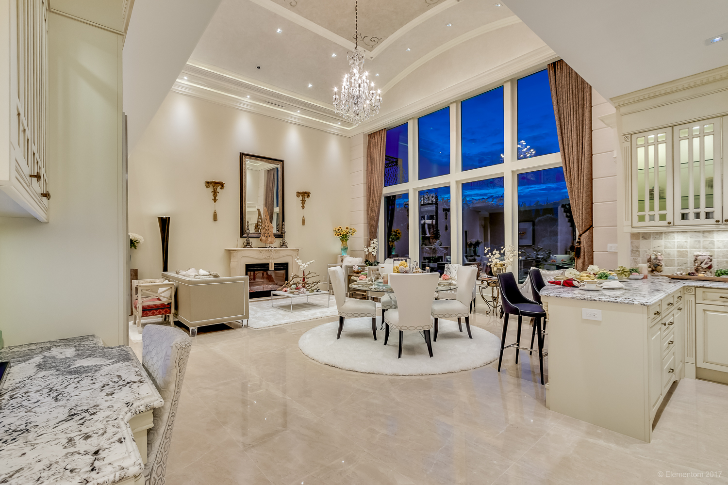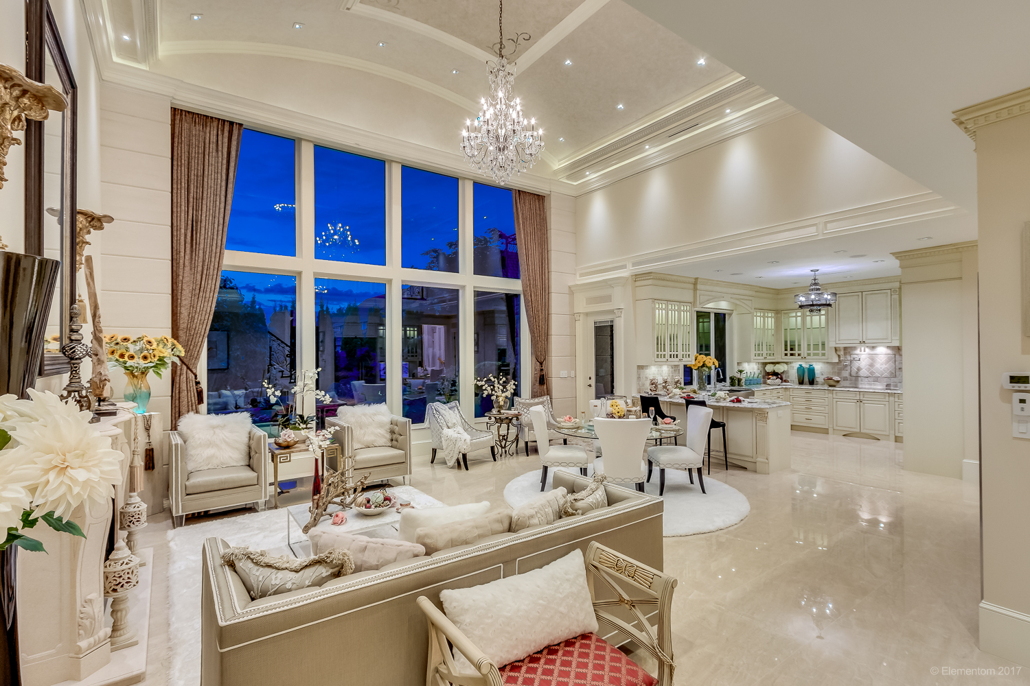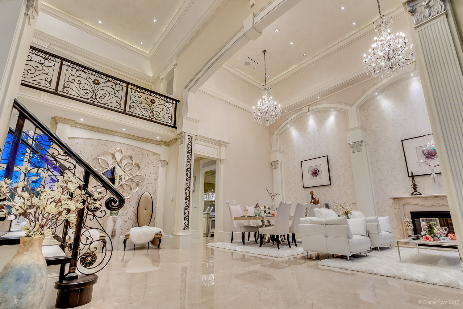 Soaring double-height ceilings and a chandelier-lit entry create an unforgettable sense of arrival from the moment you step inside.