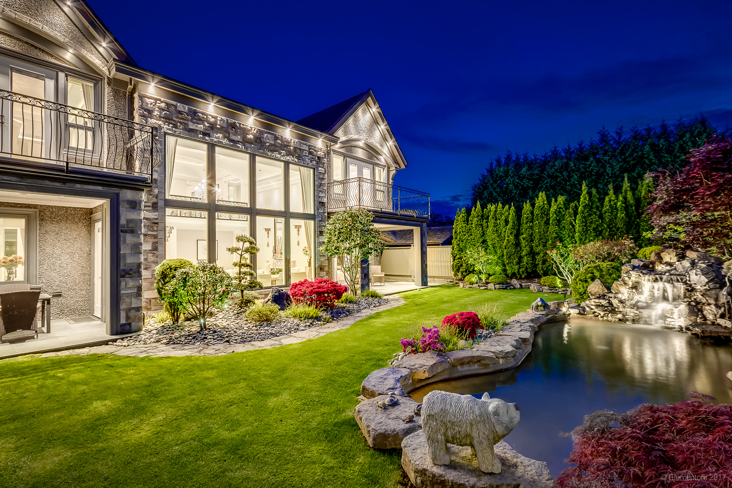 A landmark estate featuring 23-foot ceilings, five spacious ensuite bedrooms, and layered architectural lighting throughout. Set on a wide rectangular lot with expansive balcony and patio living, it is framed by tranquil, manicured gardens that offer privacy and seasonal beauty year-round.