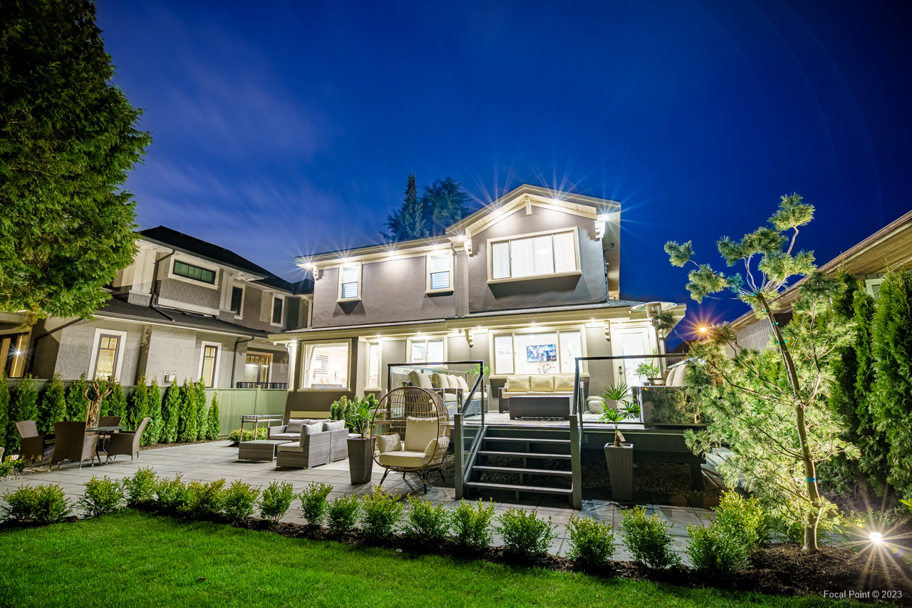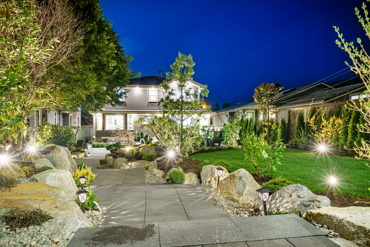 Dramatic exterior lighting that highlights the home’s lines and landscaping, making it feel elevated day or night.