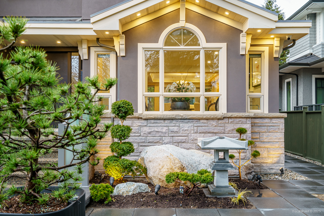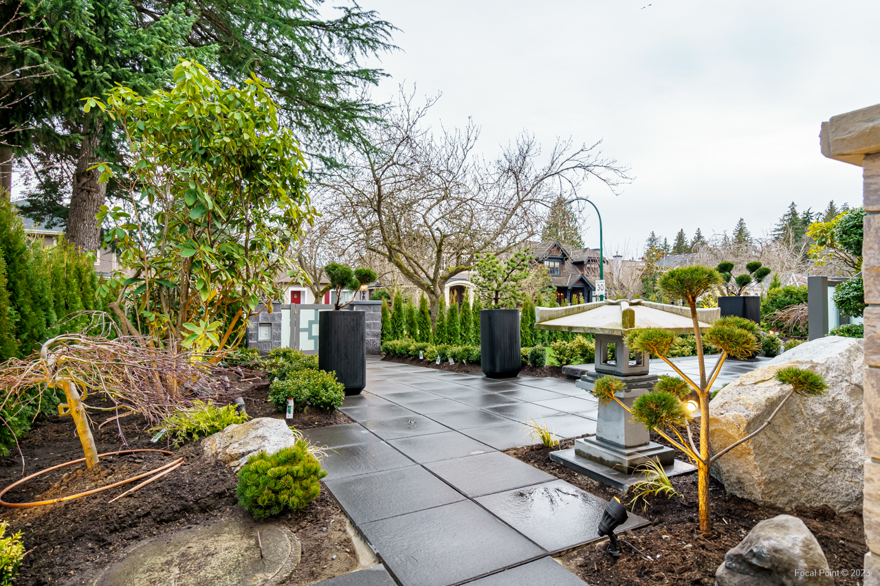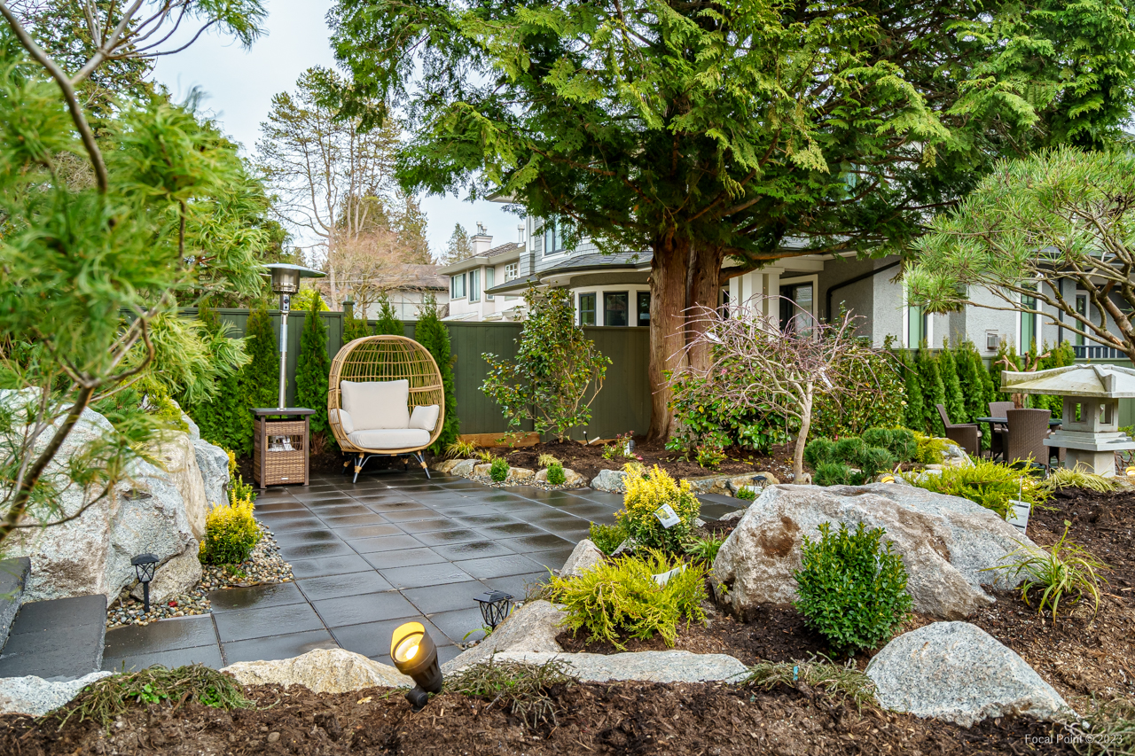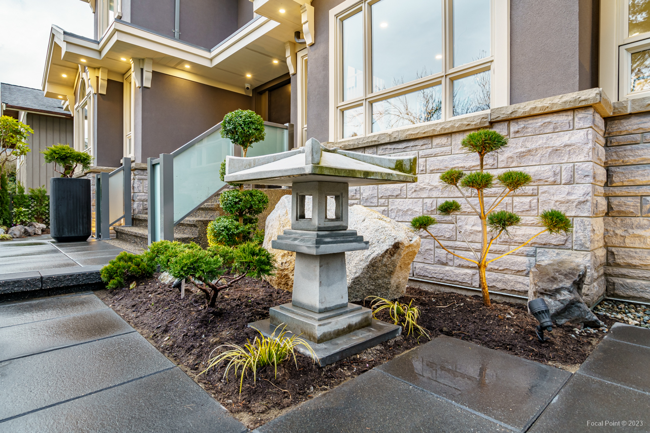 Sculptural boulders, layered greenery, and a statement stone lantern that give the outdoor space a refined, garden-like presence.