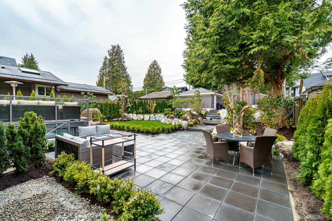 An expansive patio with multiple seating zones and a manicured lawn, designed for effortless entertaining.